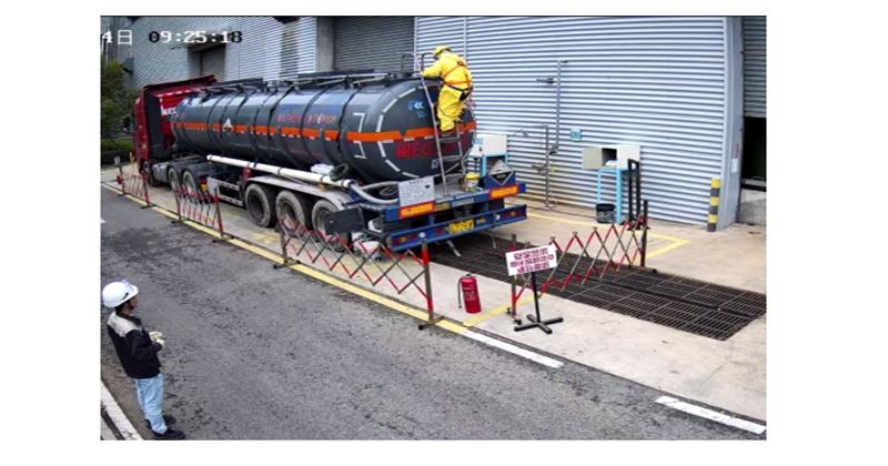 槽車到位后識別圍籬、滅火器、警示標識、人員著裝規范等。